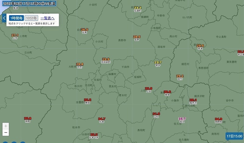 長野県内でも、穂高(安曇野市)や松本などは30℃を超えており佐久では35.7℃の猛暑日になっています。