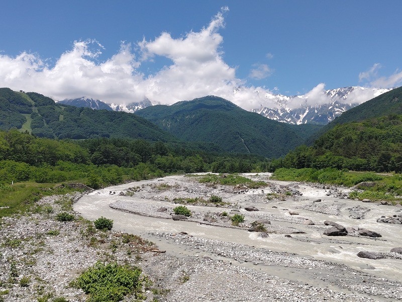 最後は、白馬大橋からの景色です。こちらは途中に遮るものがないため白馬三山をクッキリと眺めることができます。と書いていて思ったのが、よく見ますとこの3枚(3ヶ所)いずれも肝心の「白馬三山が雲に隠れている」ではないですか・・・(涙)