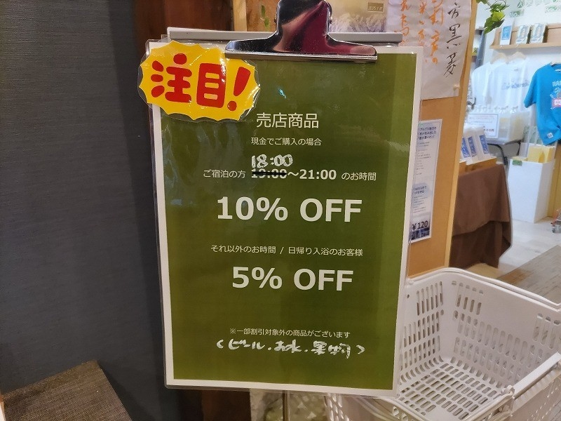 18:00~21:00まで現金でご購入いただきますと、10%の割引をさせていただきます。(一部、対象外の商品がございます)。他の時間帯でも、現金でご購入いただきますと5%の割引をさせていただきますので、日帰り天然温泉「天神の湯」のご入浴後でも大丈夫です。