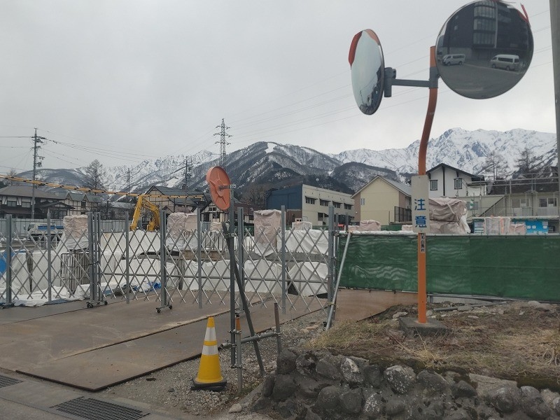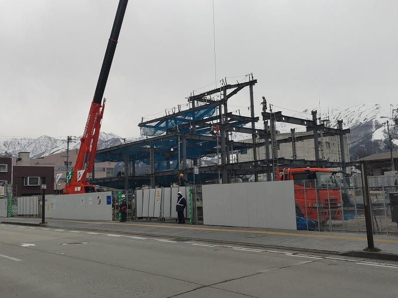 こちらは、JR白馬駅前で行われている工事です。こちらの建物には、この秋にコンビニとアウトドアショップ、カフェや宿泊施設などが入るようです。