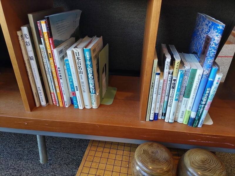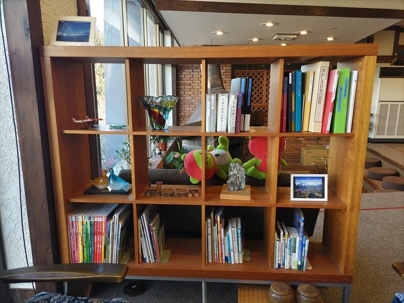 こちらの本棚には、過去の「じゃらん」や「るるぶ」などの観光情報誌や地元にまつわる書籍、