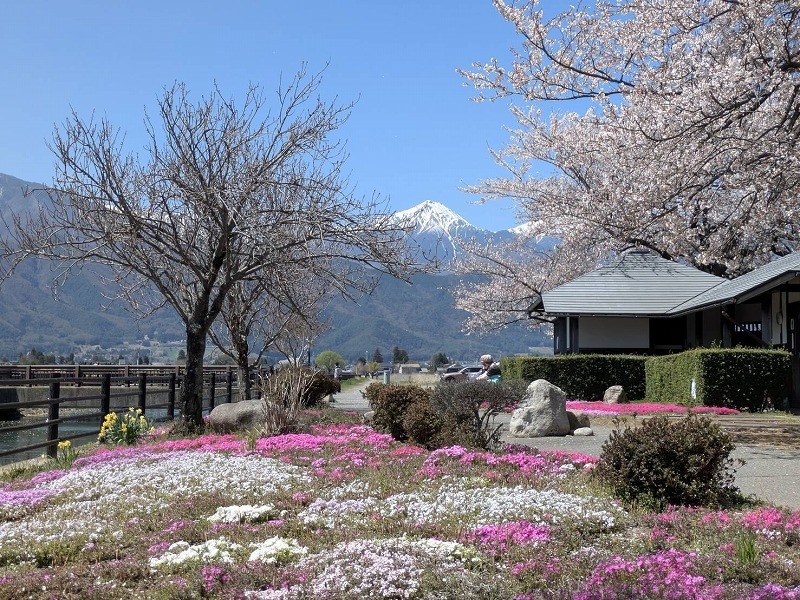 桜の時期が終わりますと、安曇野の田んぼには水が貼られて常念岳をはじめとした山々が田んぼの水面に映り込む水鏡を楽しむことができますよ。