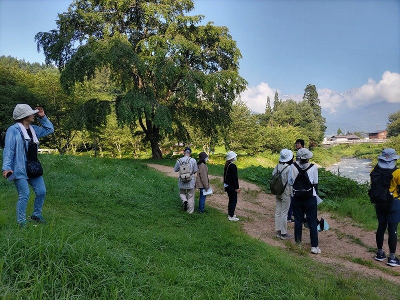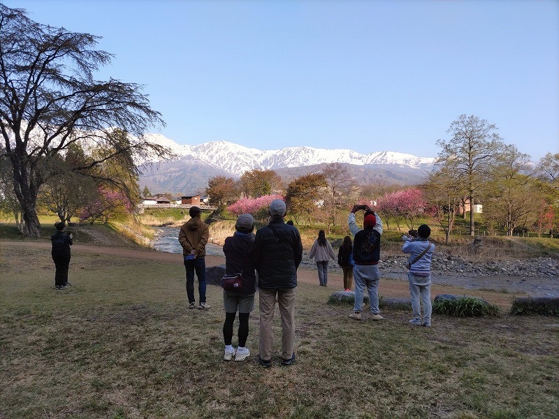 こちらのイベントは、毎週日曜日の朝にホテルから大出公園までの約2kmを50分ちょっとかけて歩いていくイベントです。道中では、季節の移り変わりや眺めることのできる北アルプスの山々のご紹介、白馬の歴史や文化、花情報、不動産情報など多岐にわたってご紹介させていただいております。