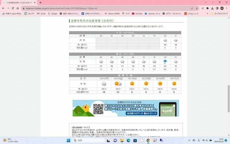 こちらは、ホテルのフロントでお出ししている「てんきとくらす」サイトのものです。(16時41分時点)。ご覧の通り、14日(土)、15日(日)と快晴の予報に変わってきました。